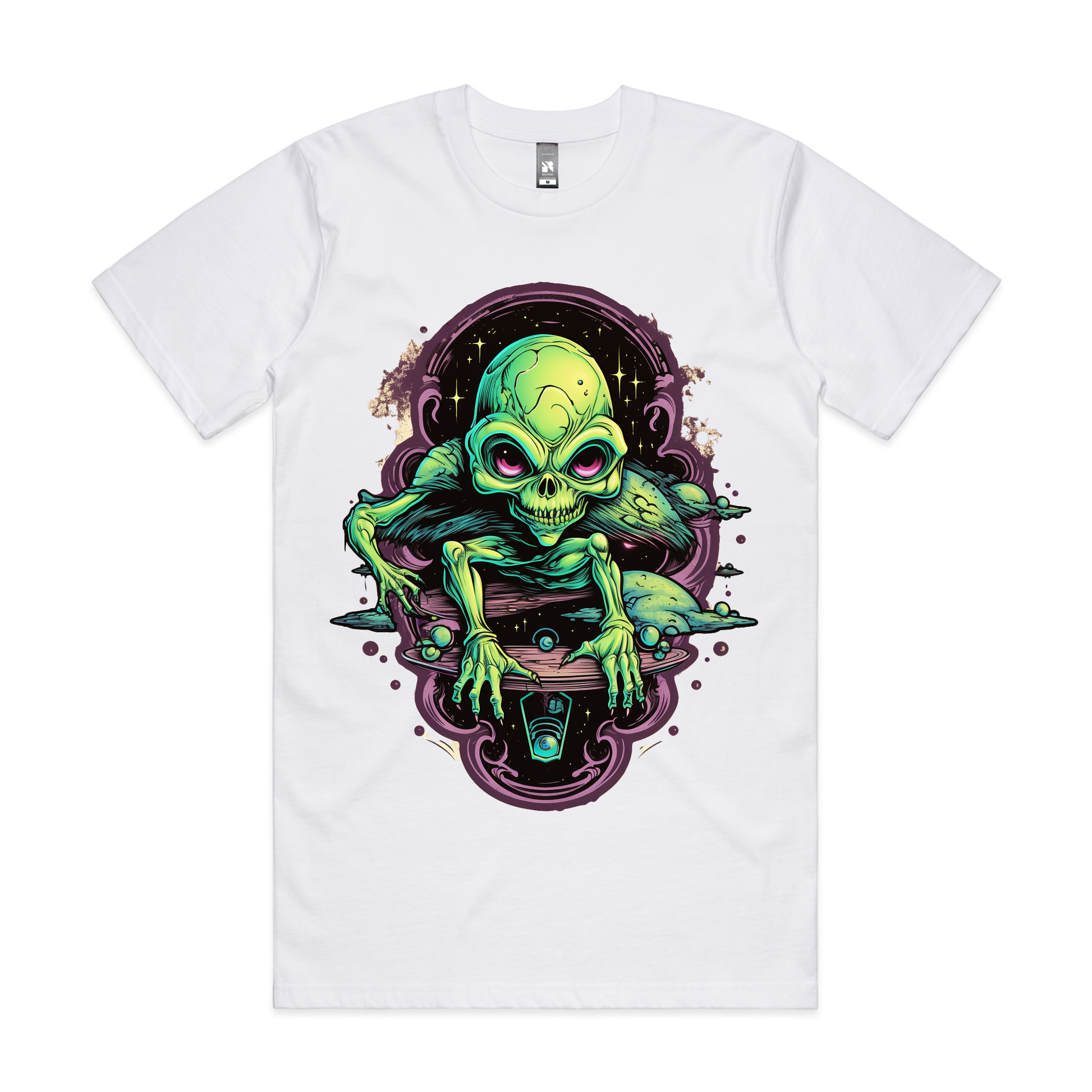 This Alien skateboarding tshirt is crafted from a 220GSM, 22-singles 100% combed cotton material for comfort and a relaxed fit. It features a crew neck and double needle hems for superior quality. Wear it to the track to show pride in your chosen skater and boost your spirit. Look fashion-forward while staying on top of the trend with this Shark Attack t-shirt. Soft white fabric hosts a bold, red graphic of a shark leaping from the sea, lending a fearless flair to any outfit.